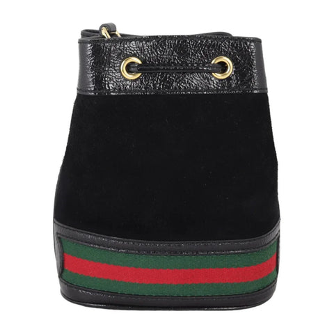 This chic bucket bag is crafted of black leather and suede with signature Gucci detailing. The piece features the classic Ophidia mini silhouette, ...