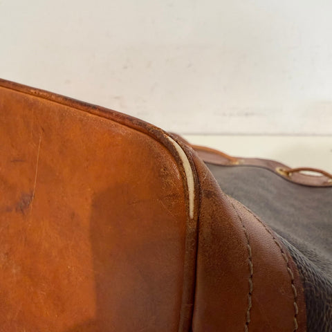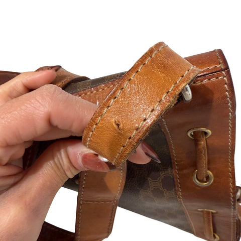 This chic bucket bag is crafted of brown printed canvas with matching leather trim. The bag features gold-tone hardware, a single shoulder strap, a...