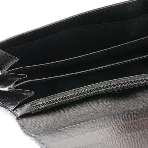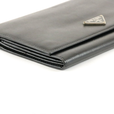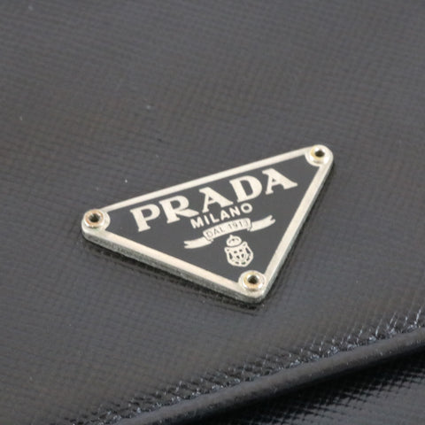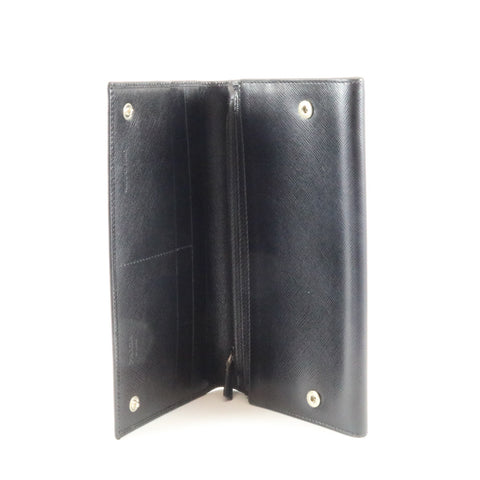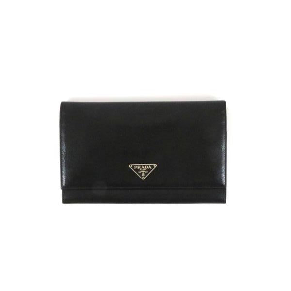 This wallet is crafted of saffiano leather in black and has a silver Prada logo on the front flap. The front facing flap opens to a roomy partition...