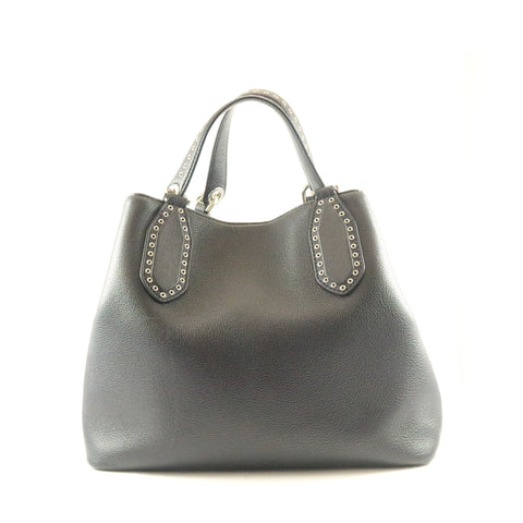 Black grained leather Michael Michael Kors bag with silver-tone hardware, single flat shoulder strap, dual flat top handles, grommet accents at ext...