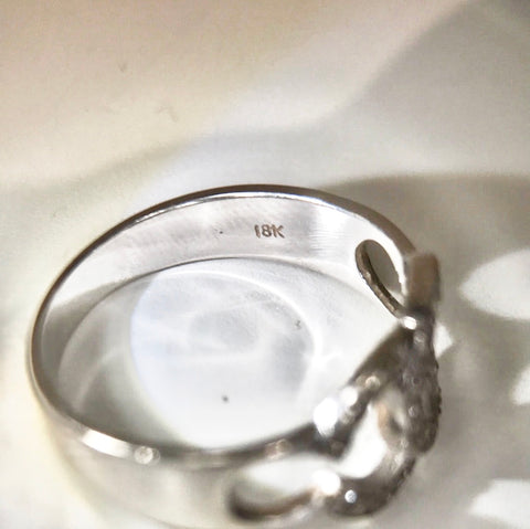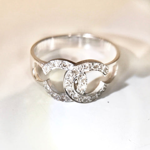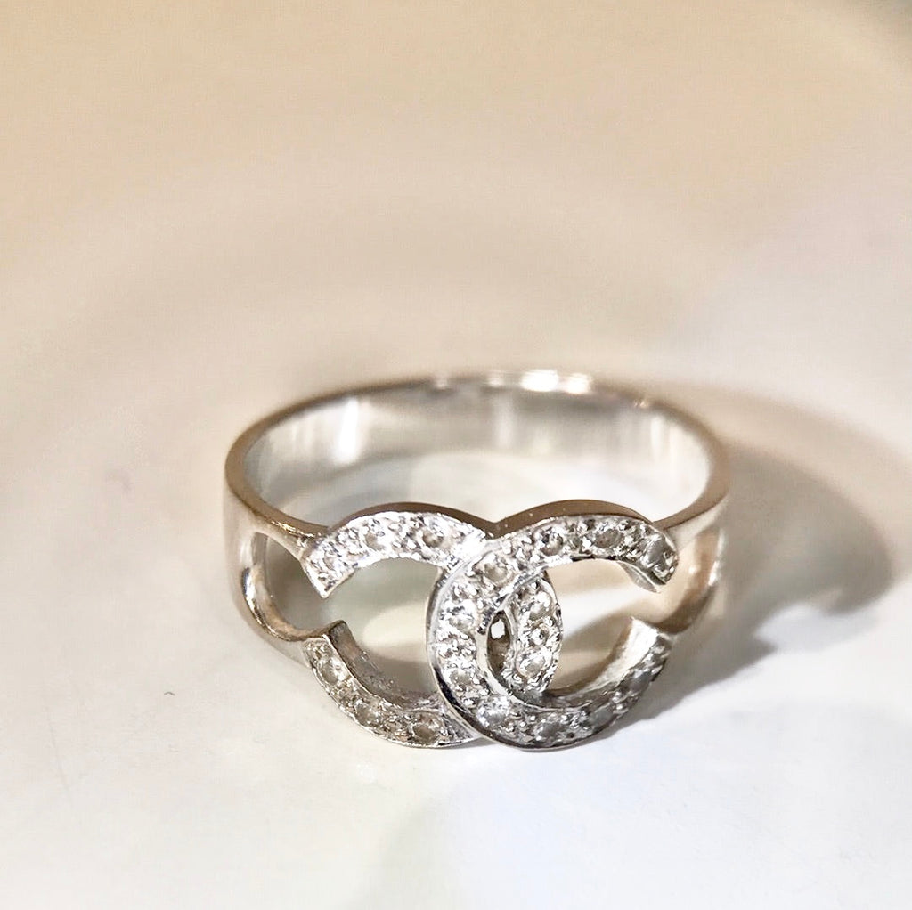 An 18k white gold ring with CC design in genuine diamonds. The ring comprises of 18 round brilliant cut diamonds, totalling approximately 0.07ct, a...