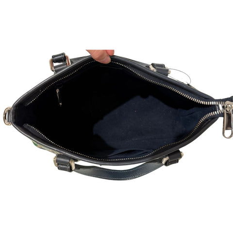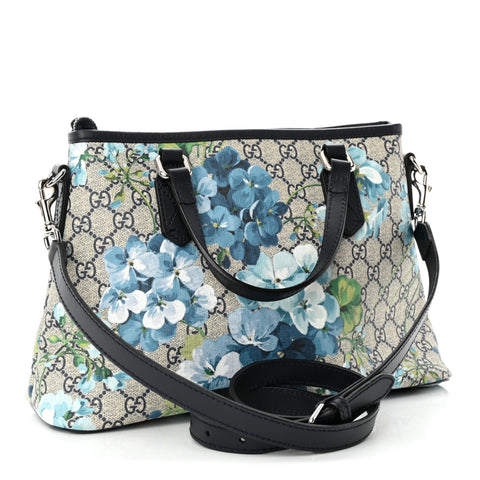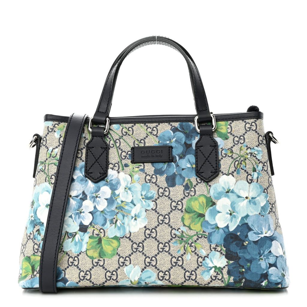 This stylish tote is crafted of GUCCI GG Supreme monogram canvas with blue and white blooming flowers . The bag features dark navy leather strap to...