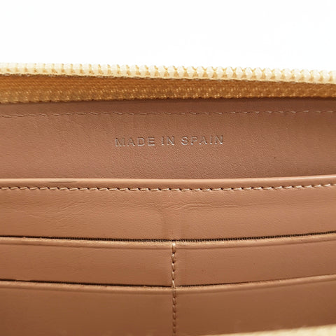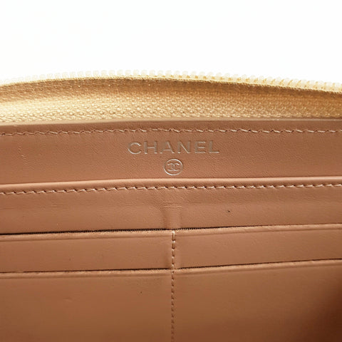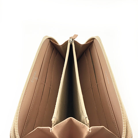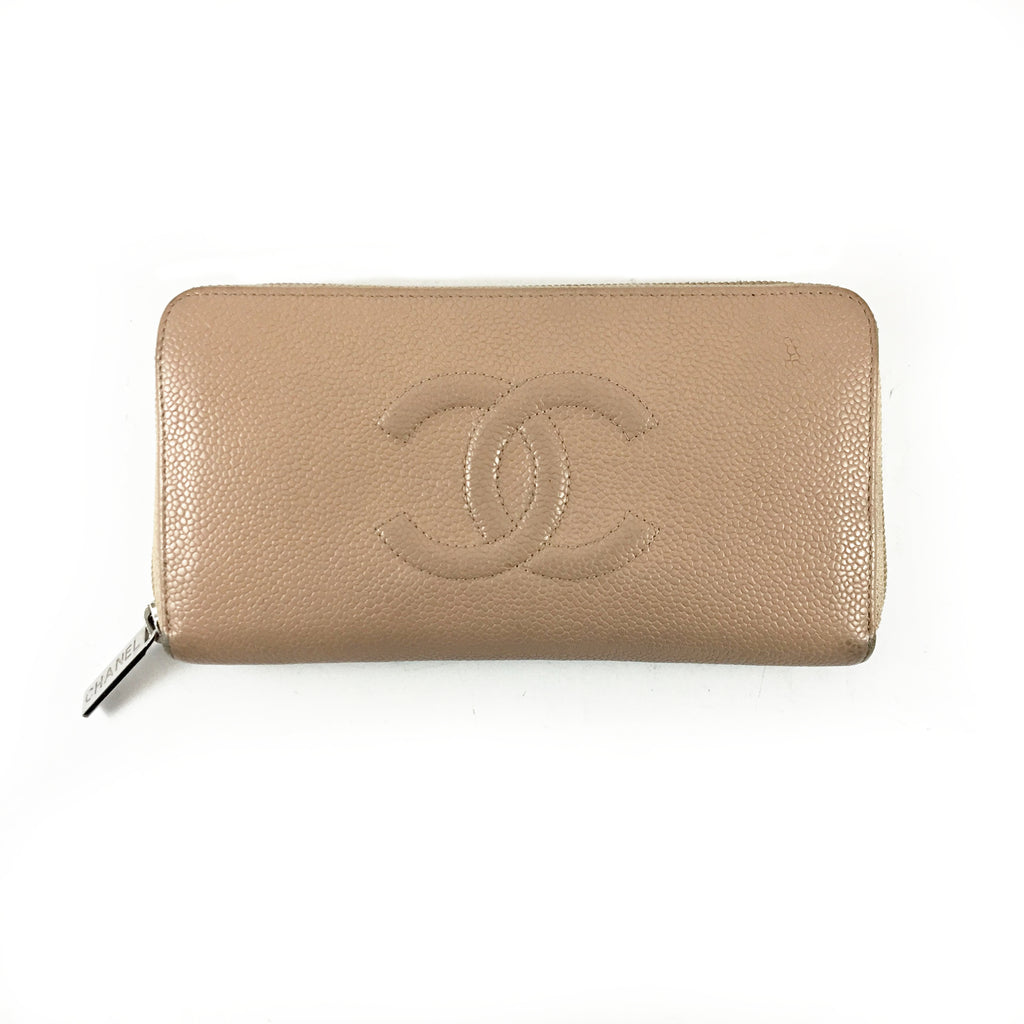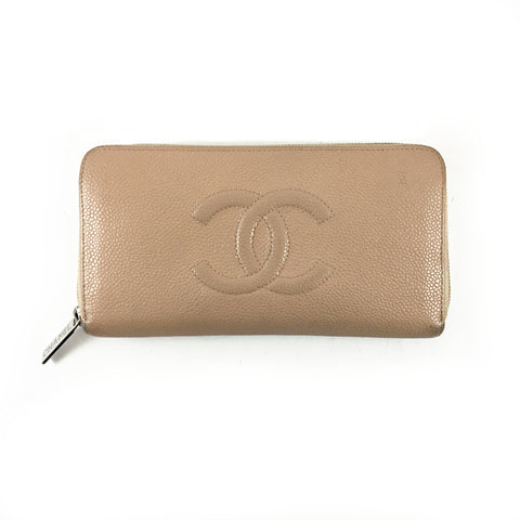Beige Caviar leather Chanel Timeless Organizer wallet with silver-tone hardware, stitched CC logo accent at front, tonal leather and beige grosgrai...