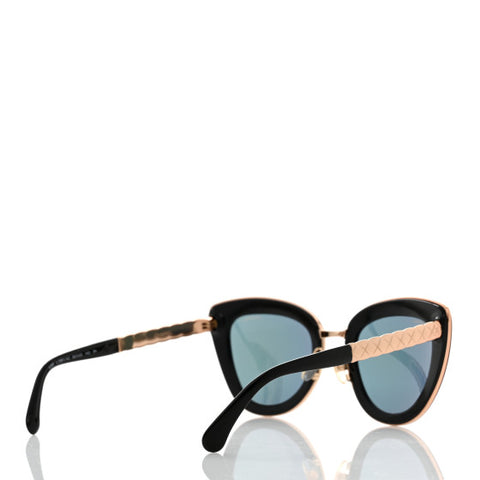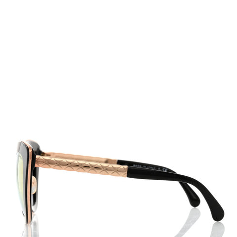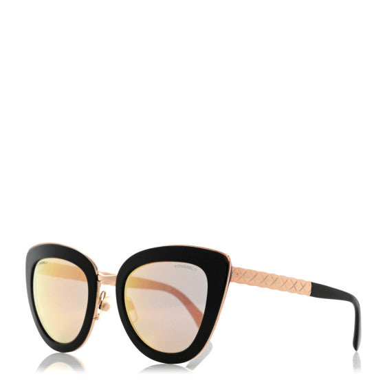 These stunning sunglasses have classic black rims with rose gold trim and gradient tint. The arms feature a quilted rose gold bars with a Chanel CC...
