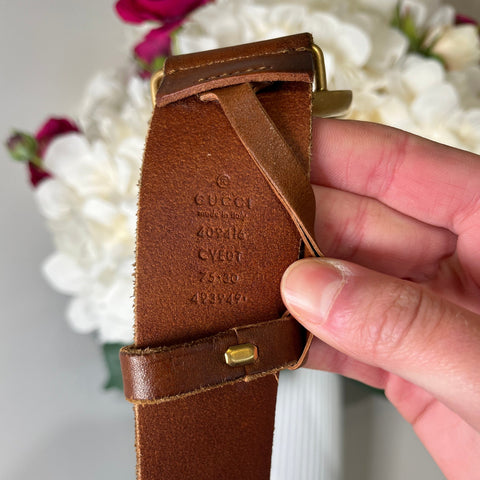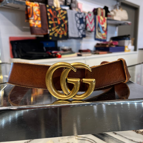 An unfinished faded leather belt in brown with a Double G buckle. Brown faded leather Antique brass hardware Double G buckle Buckle: 3.03"W x 2.36...