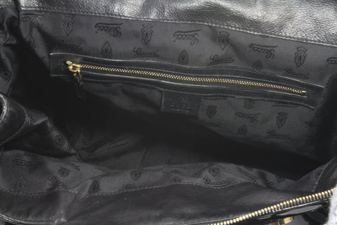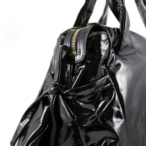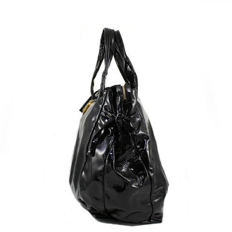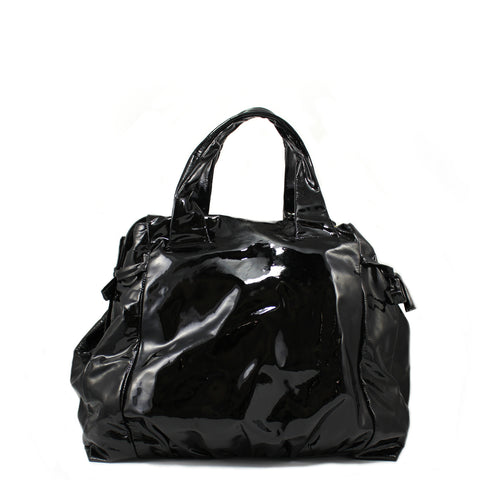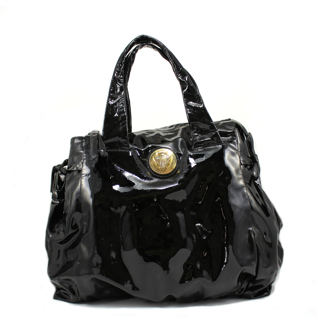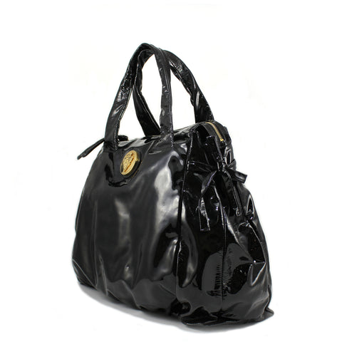 Carry sophistication on your arm with a sleek tote bag from Gucci. This designer tote flaunts a bright gold-tone Gucci crest against black patent l...
