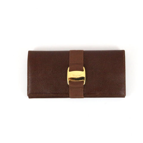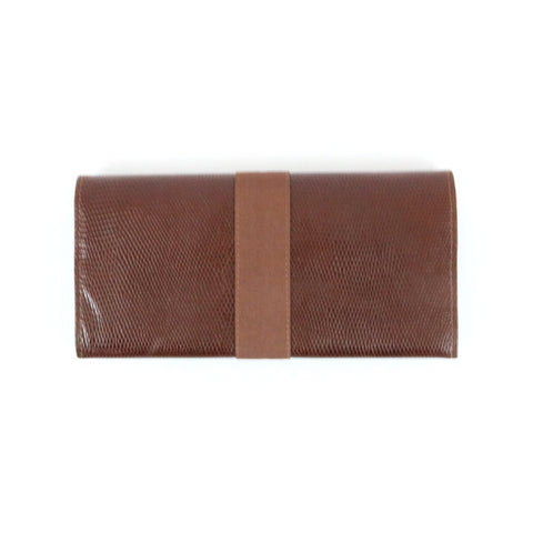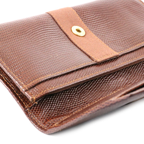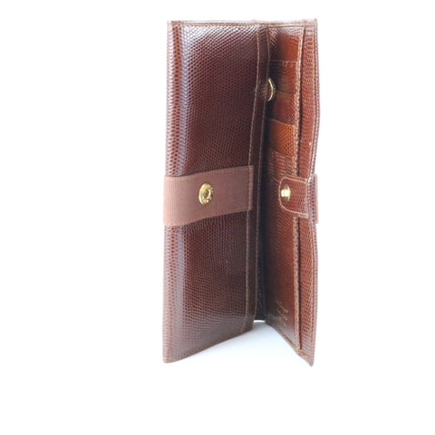 This stunning wallet is crafted of fine lizard in tan. The flap opens to a matching lizard leather interior with card slots, patch pockets and a zi...