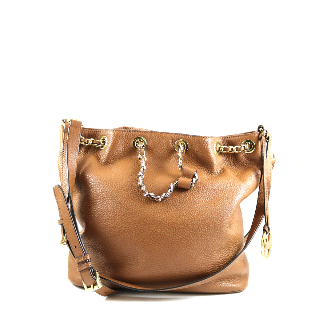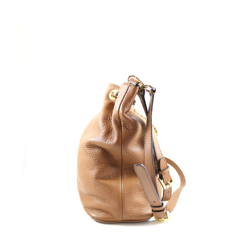 Michael Kors brown crossbody bag with gold- tone hardware and a detachable/adjustable shoulder strap. The bag features both snap and drawstring clo...
