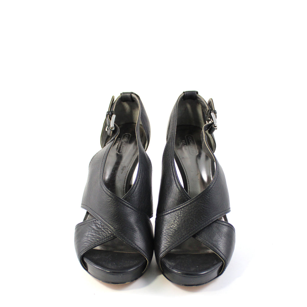 Coach black leather platform sandals with cross over design on front.  Size: 8.5 Condition: Good Estimated Retail Value: $145