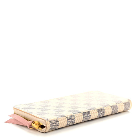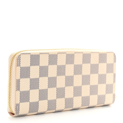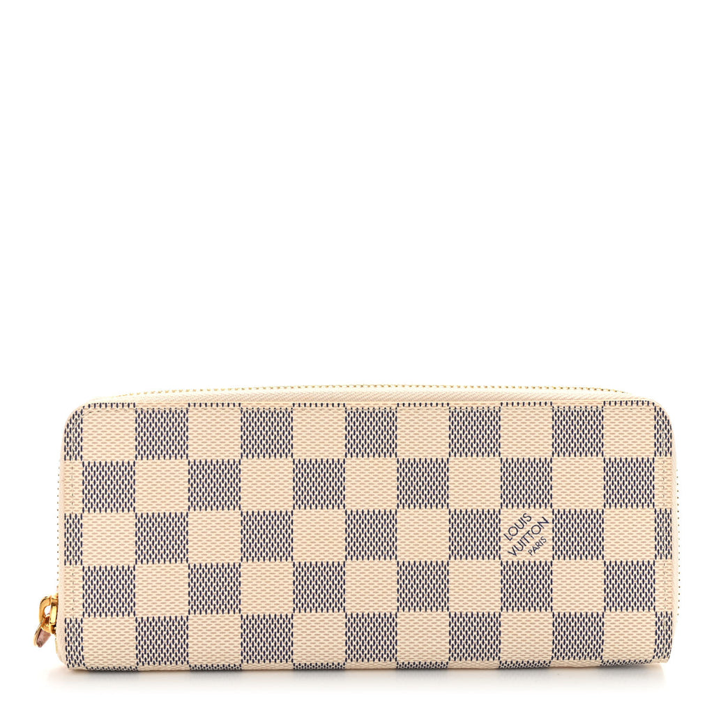 This stylish wallet is crafted of Damier checkered canvas in blue and white. The wrap-around brass zipper opens to a partitioned interior of balle...