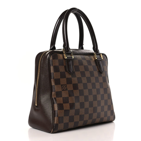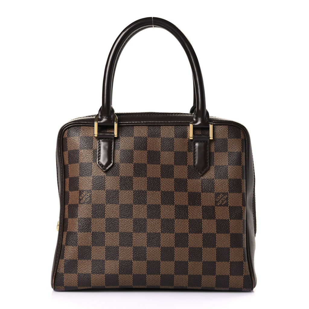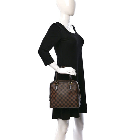 This handbag is crafted of signature damier toile canvas in brown. It features dark brown smooth leather top handles with brass links and cross-gra...
