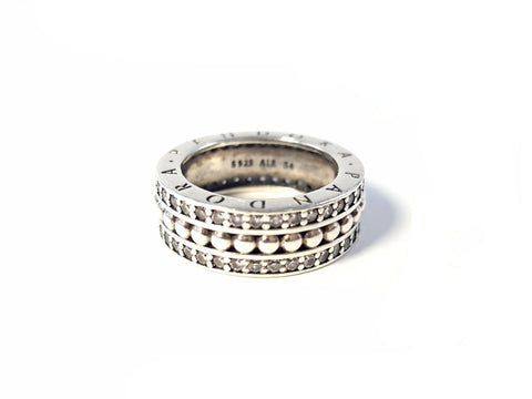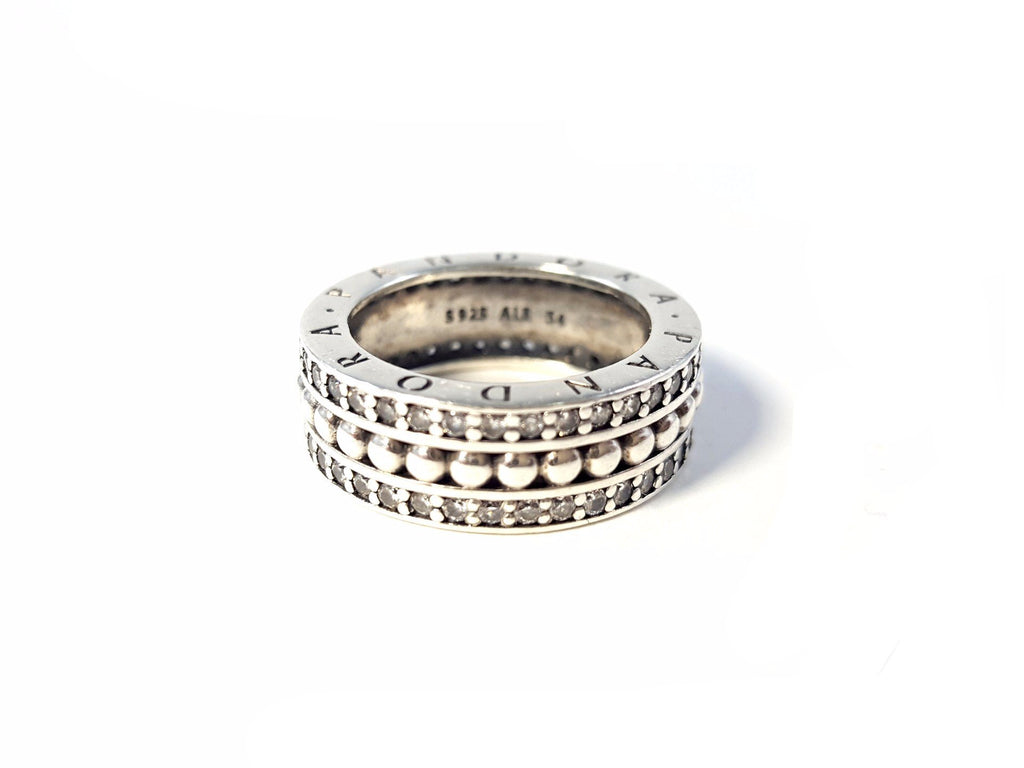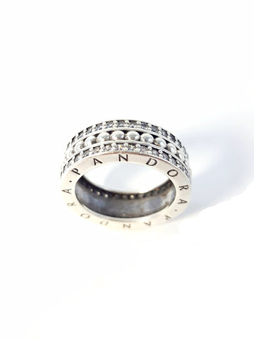 Beaded details, twin lines of sparkling stones and a stylish PANDORA logo ensure that this sterling silver statement ring is a tribute to everlasti...