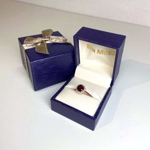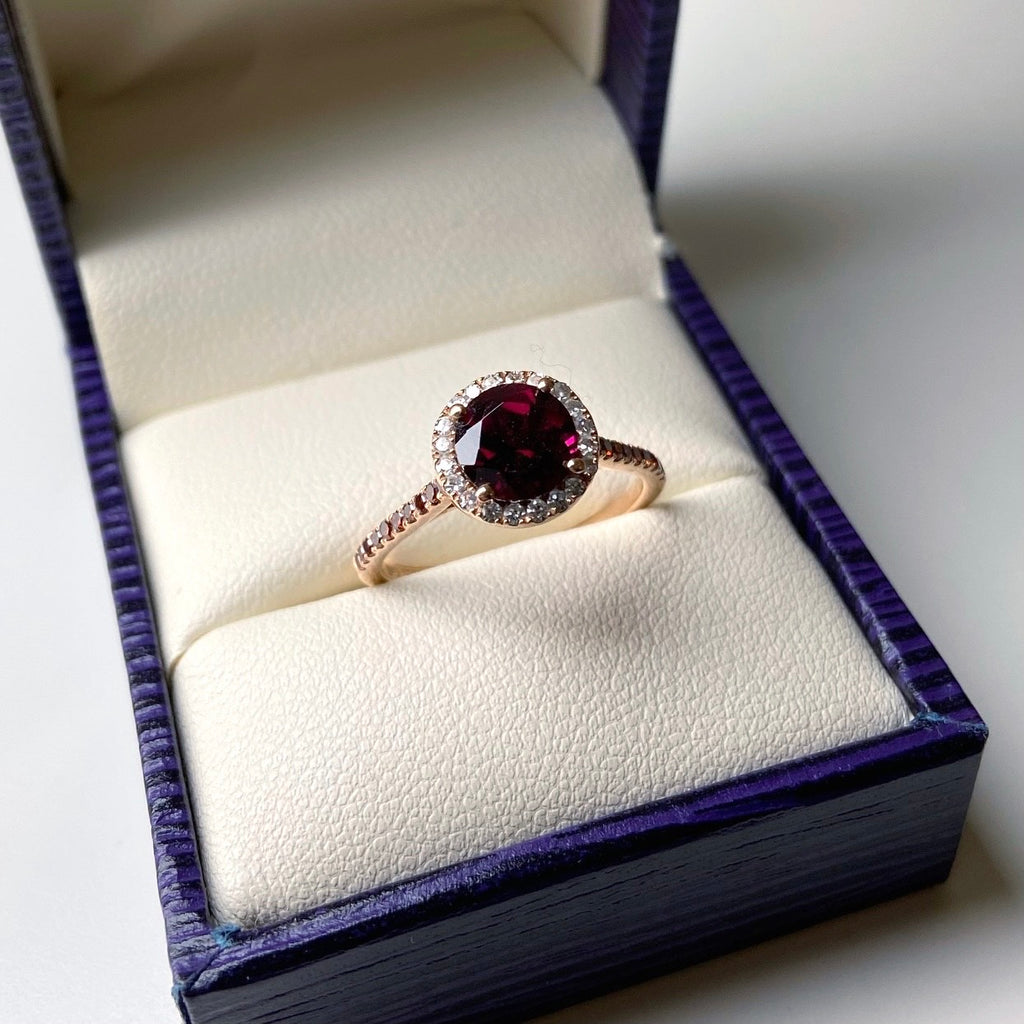 This modern garnet and diamond halo ring is crafted in 10-karat rose gold and features a round solitaire garnet placed at its center with 20 round-...