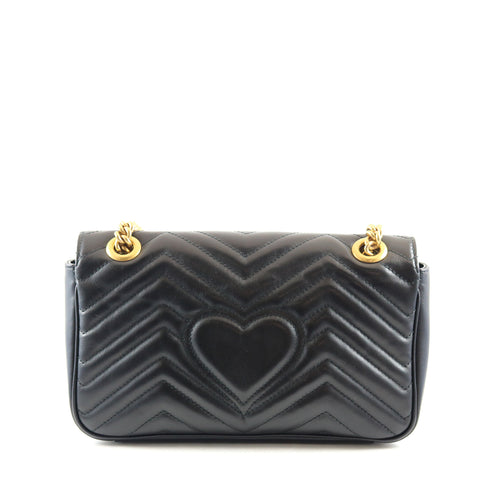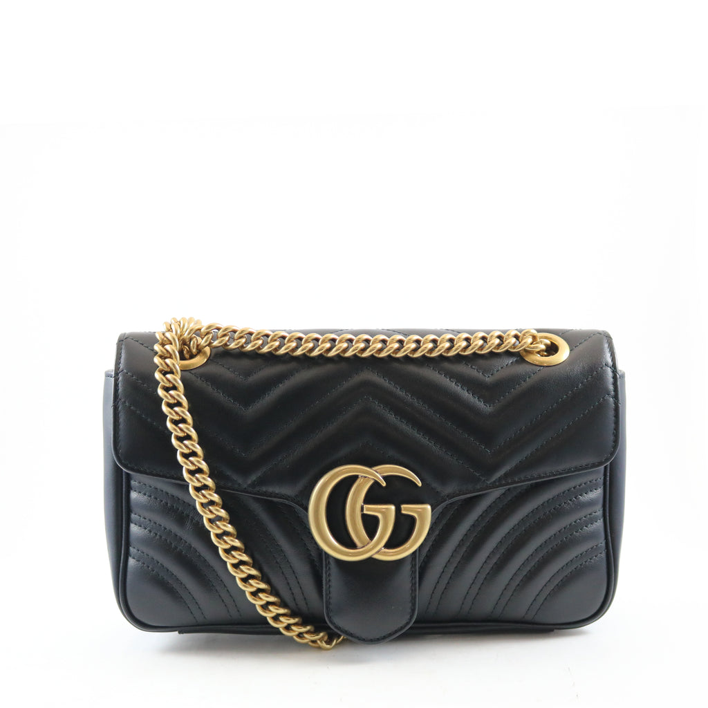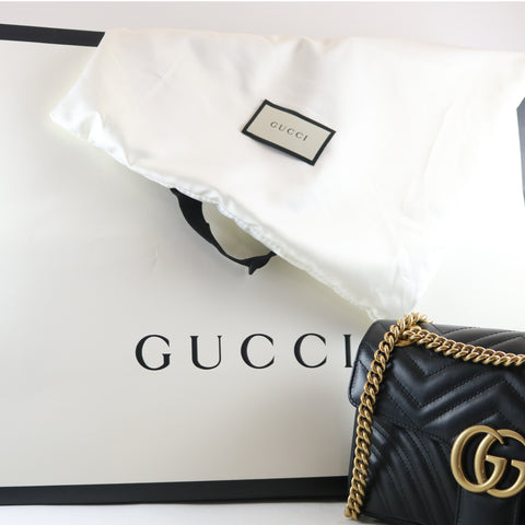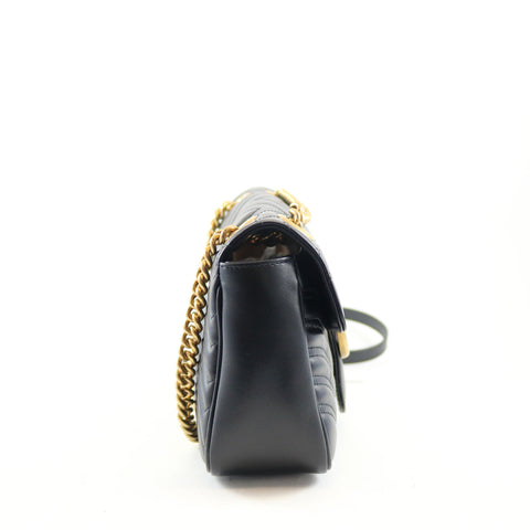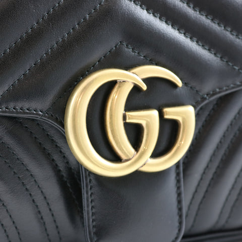 Black matelassé leather Gucci GG Marmont Small shoulder bag with antiqued gold-tone hardware, convertible chain-link shoulder strap with leather sh...