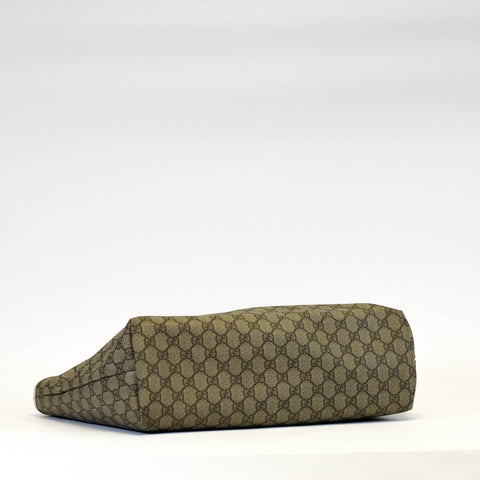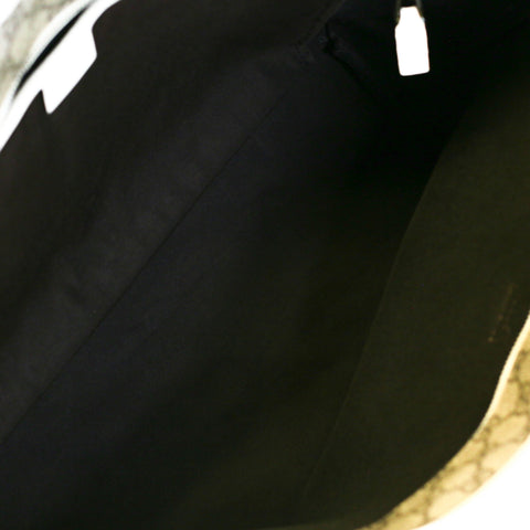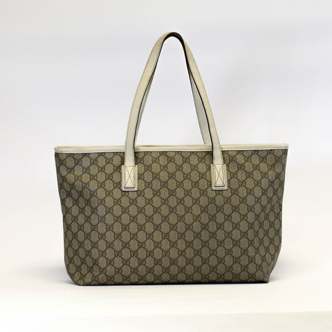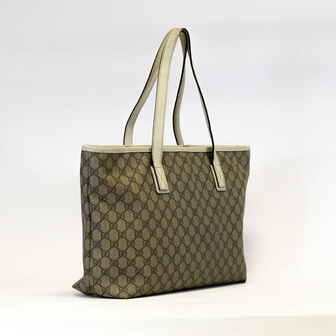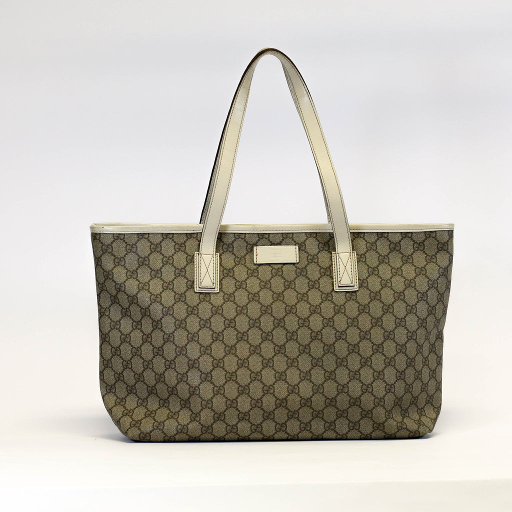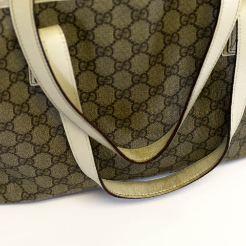 This stylish tote is crafted of GG Supreme Monogram canvas with white leather trim and leather strap top handles. The top zipper opens to a brown f...