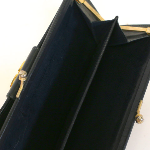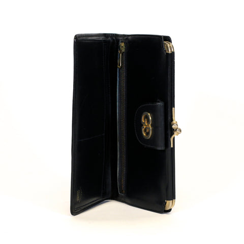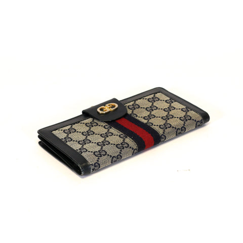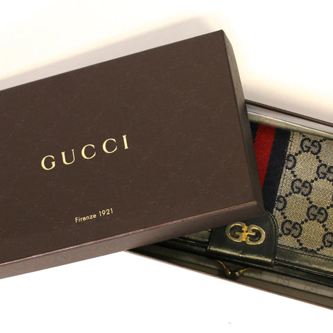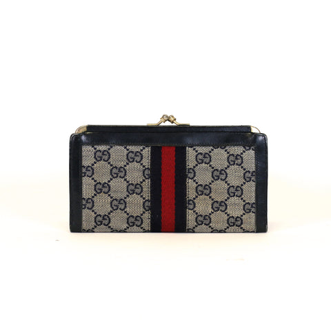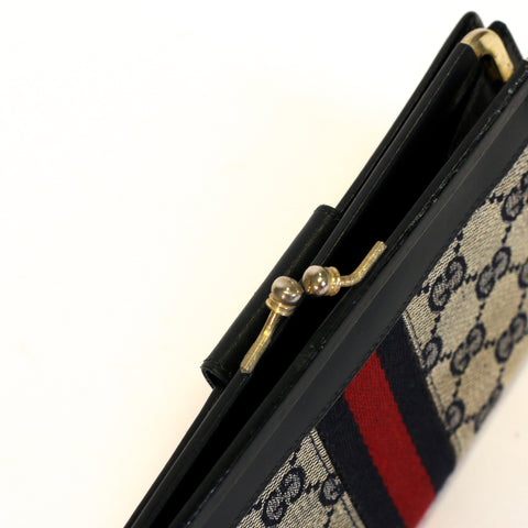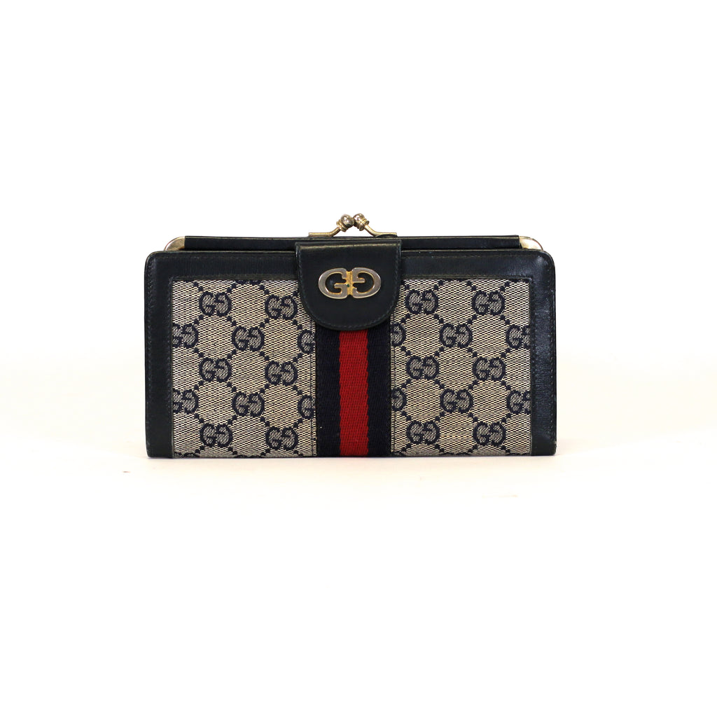This stylish clutch wallet is crafted of Gucci GG monogram canvas with dark navy leather trim and gold tone hardware. The strap opens to matching l...