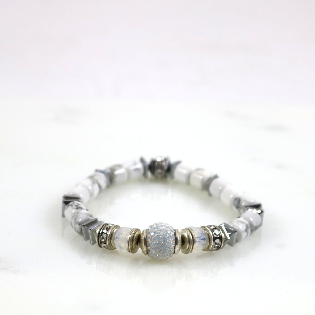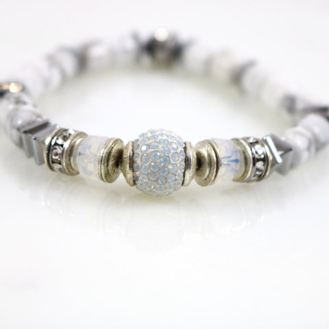 A blizzard of howlite and a shimmering opal sparkle ball are elevated by shining hematite. Howlite, 12mm opal sparkle ball, Swarovski crystal, ster...