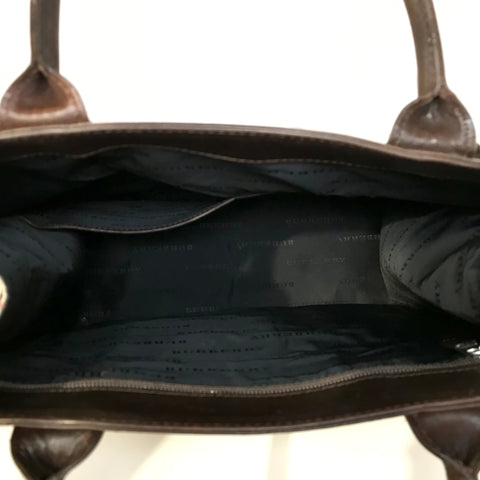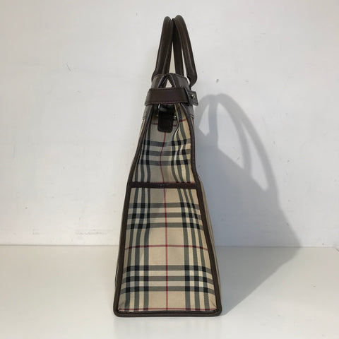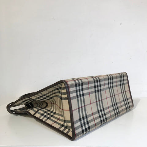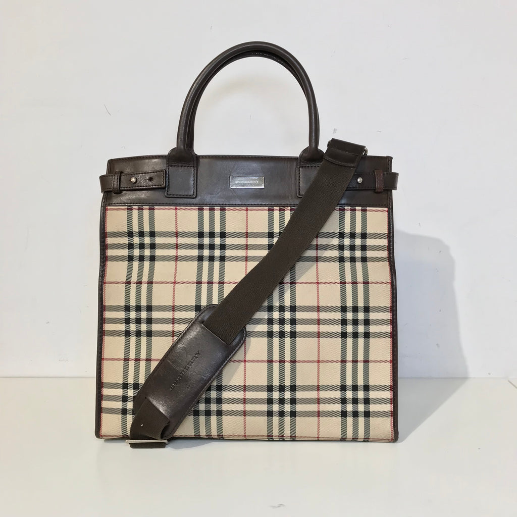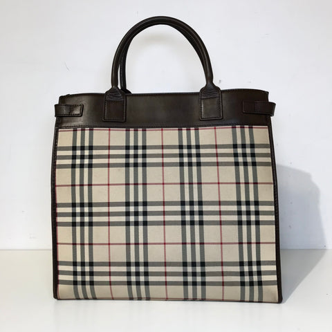This stylish tote is crafted of Burberry check canvas with brown leather trim. The bag features rolled leather top handles with side belts and an o...