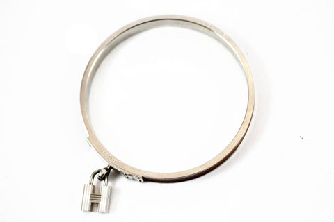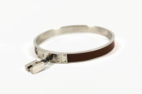 Silver-toned metal hardware and Kelly lock pendant with brown leather inlay. Condition: Near Pristine, very light surface scratches on metal Appro...