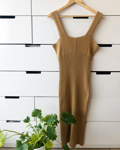 Simple tank dress from Lauren Manoogian in Curry. Scoop neckline. Tank straps. Raw hem. Straight silhouette. Slim fit.Condition: Pristine Size: 2