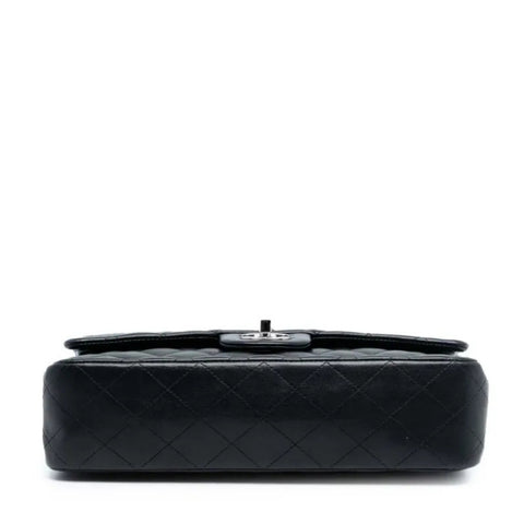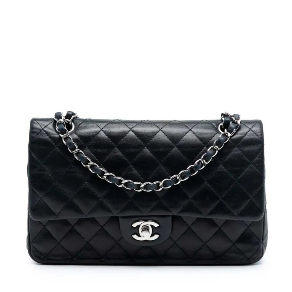 This classic shoulder bag is crafted of diamond quilted lambskin leather in black. The bag features a rear pocket, polished silver tone chain-link ...