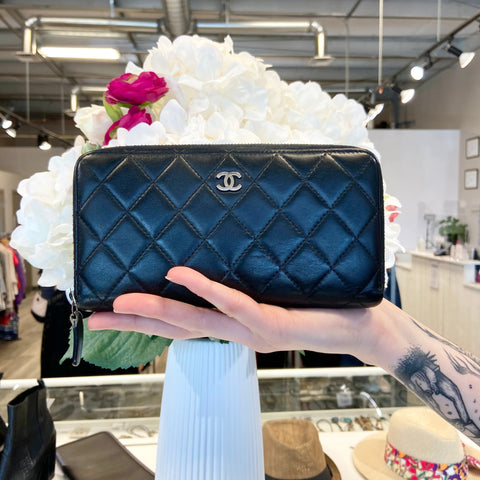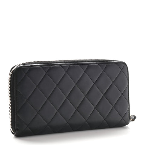 This chic clutch wallet is crafted of diamond quilted lambskin leather with a small Chanel CC logo in silver. The silver zipper opens to a partiti...