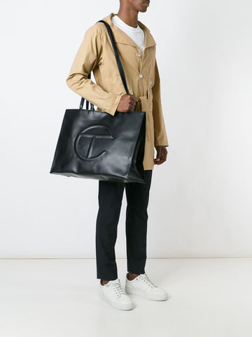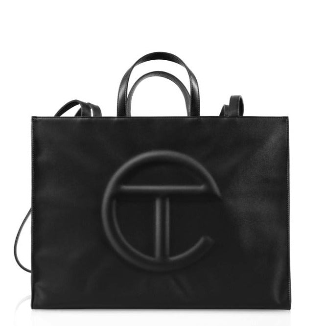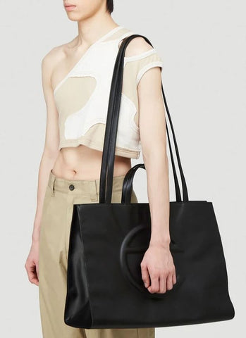 This is a tote crafted of vegan leather in black with the iconic raised Telfar logo at the front. The shoulder bag has short top handles, and two ...