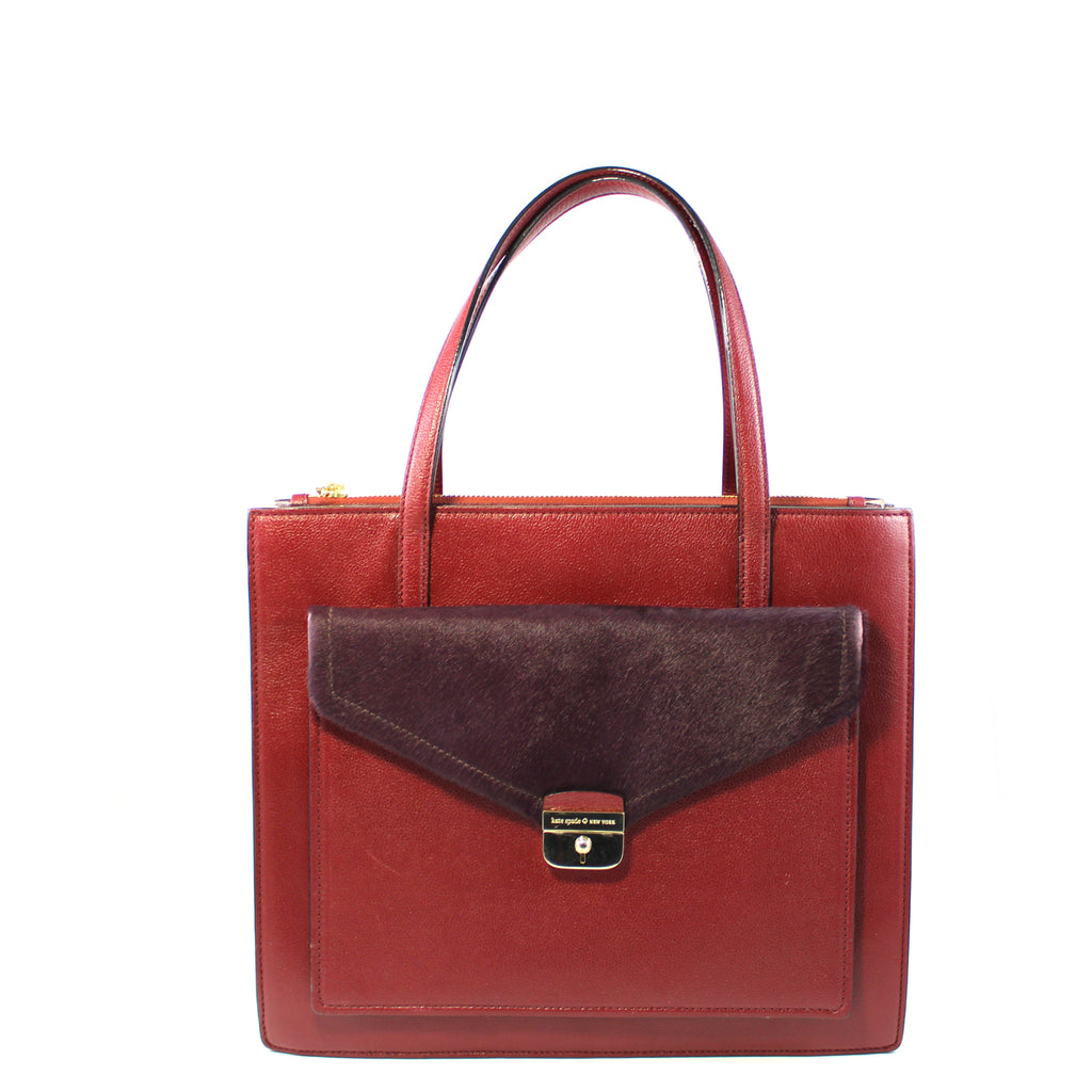 Burgundy satchel with front pocket with push lock closure, dual top handles, fabric interior, two interior slip pockets, one interior zip pocket, a...