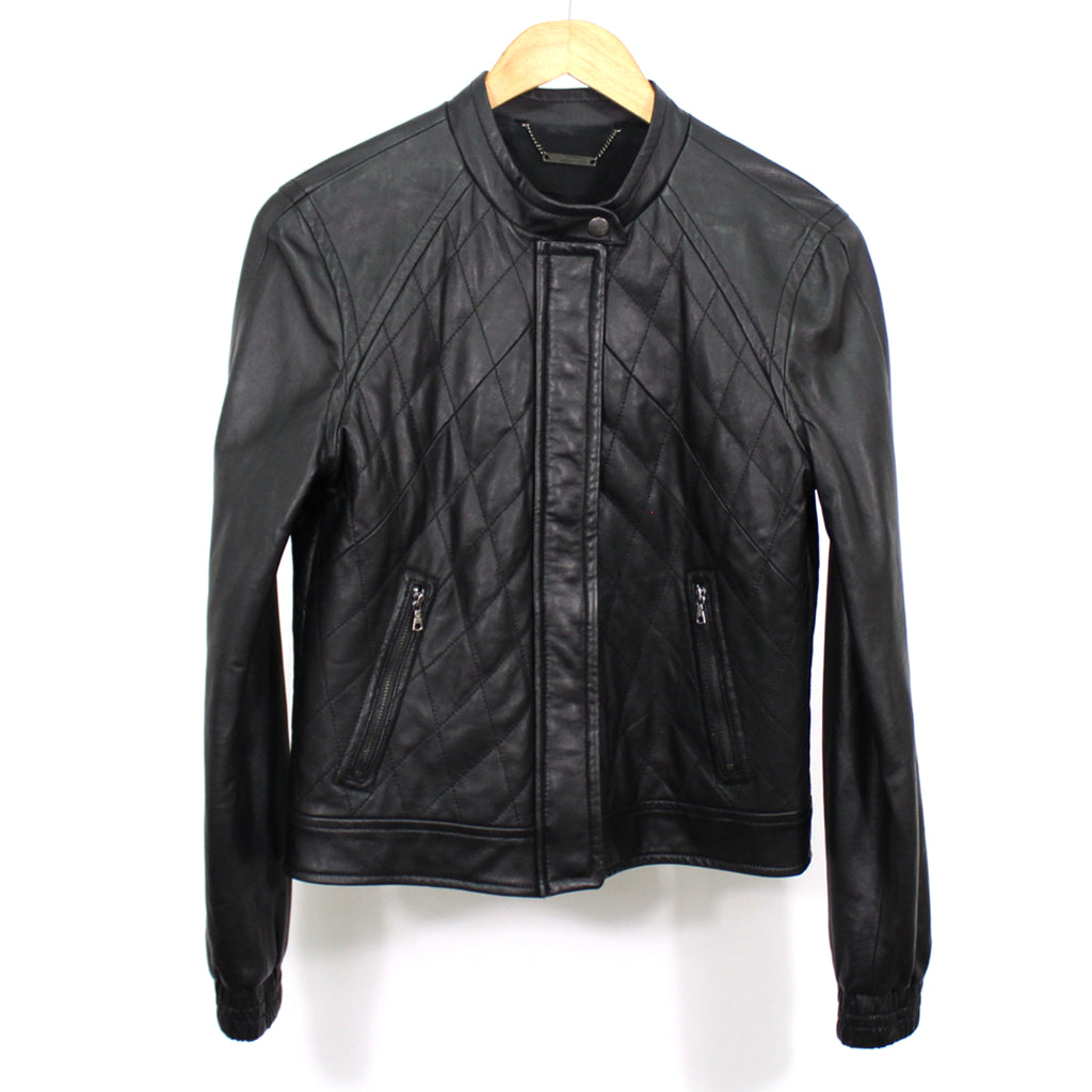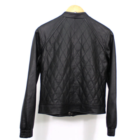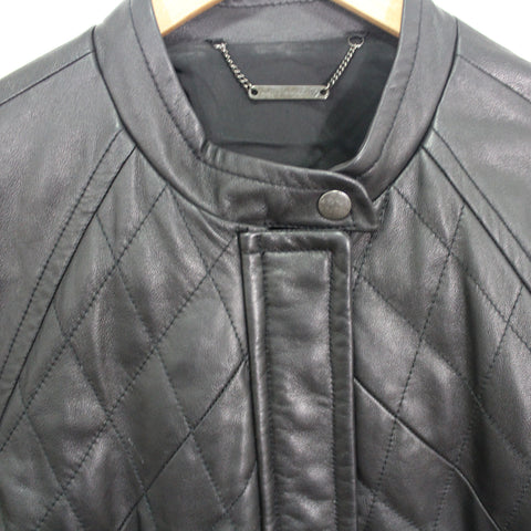 Black color enriches the fine-grain lambskin leather shaping a boxy jacket structured by letterman-inspired details and a quilted core. 22 1/2" len...