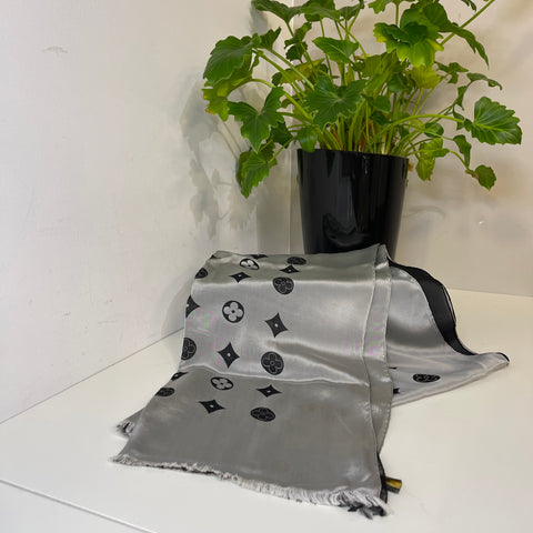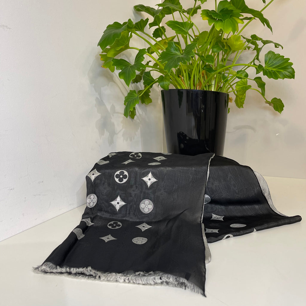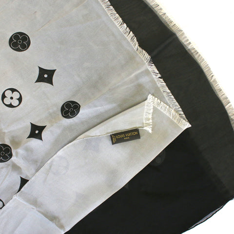 This lovely stole is crafted of 52% silk and 48% acetate and features a black with gray Louis Vuitton monogram and the opposite on the reverse. Thi...