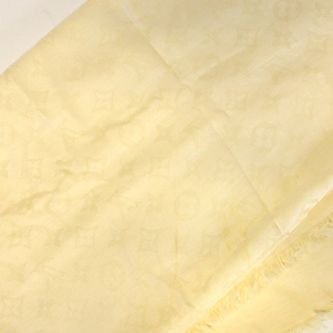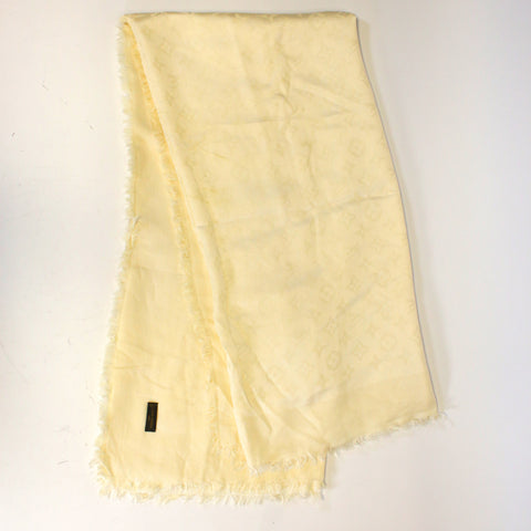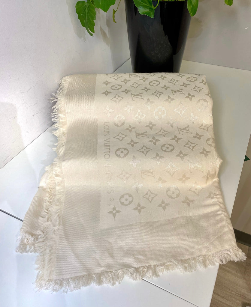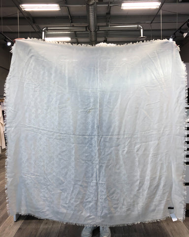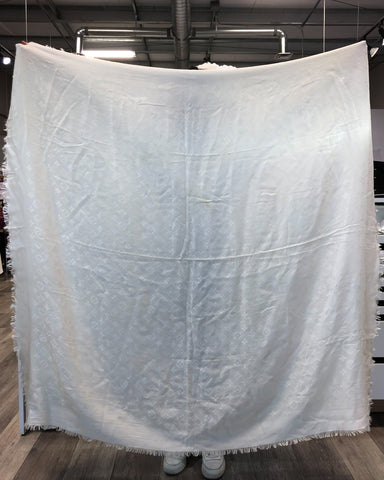 This sizable shawl features a tonal ivory Louis Vuitton monograms with a fringe border. Crafted in 60% silk and 40% wool. Very soft and supple. App...