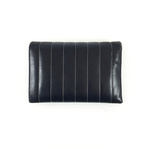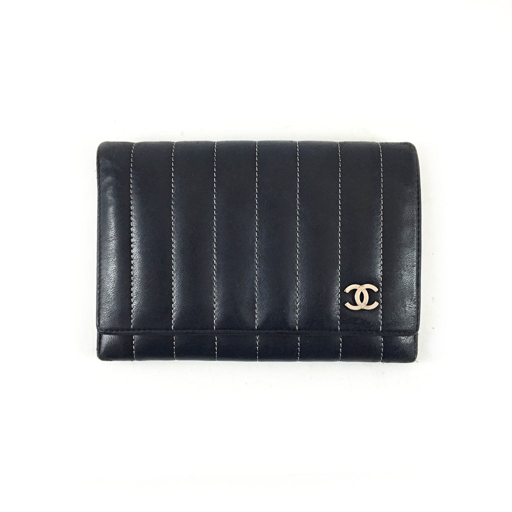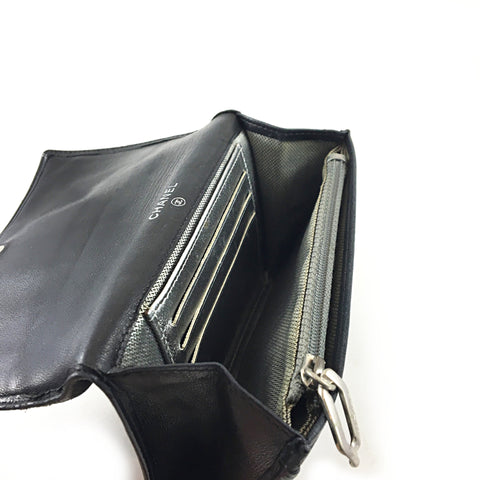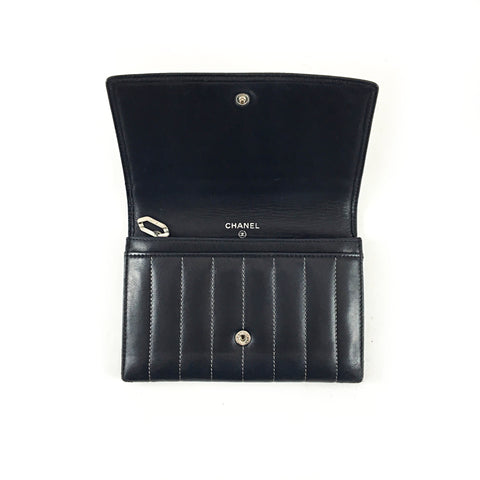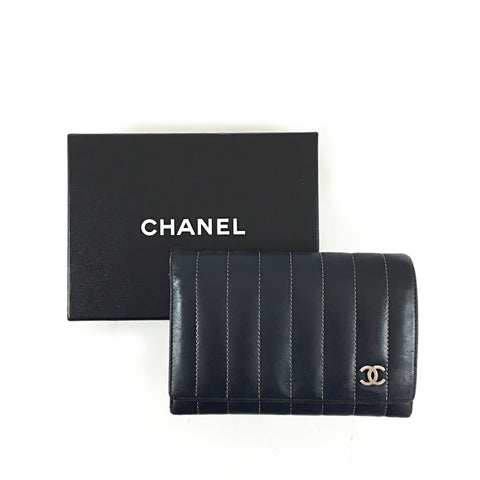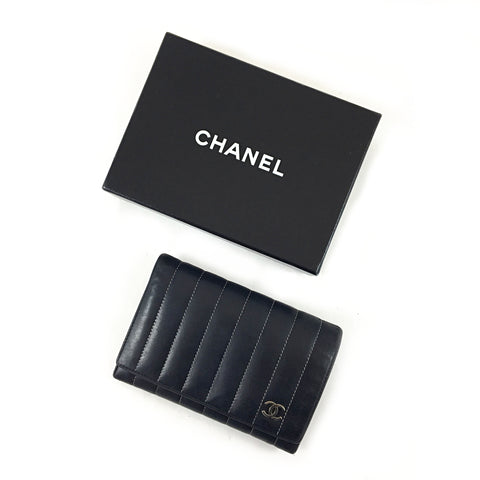 This is an elegant wallet from Chanel that is finely crafted of a bold ribbed quilted lambskin leather in black. Comes with a polished silver Chane...