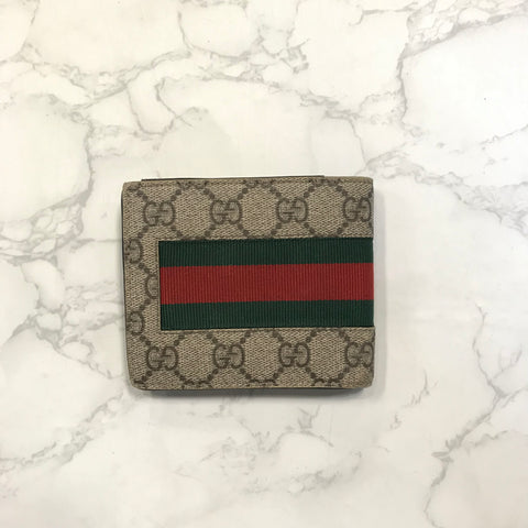 This stylish wallet is crafted of Gucci GG monogram coated canvas with a Bee embroidery. It opens to a brown leather interior with card slots and a...