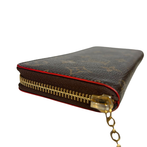 This wallet is crafted of traditional monogram toile canvas. The wallet features a cherry red resin trim and a polished brass 3/4 wrap-around zippe...
