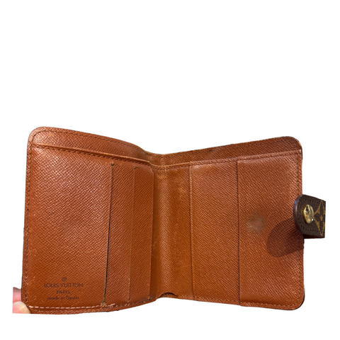 This practical small wallet is constructed of traditional Louis Vuitton monogram toile canvas with a brass snap closure. This opens to an interior ...