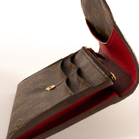 This stylish wallet is crafted of Louis Vuitton brown monogram canvas. The front snap coordinates with the red cross-grain leather interior, which...