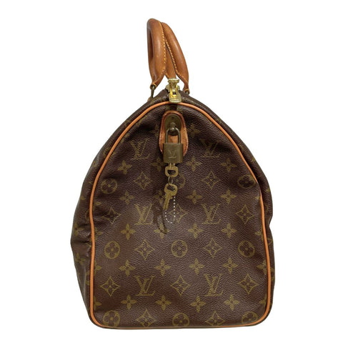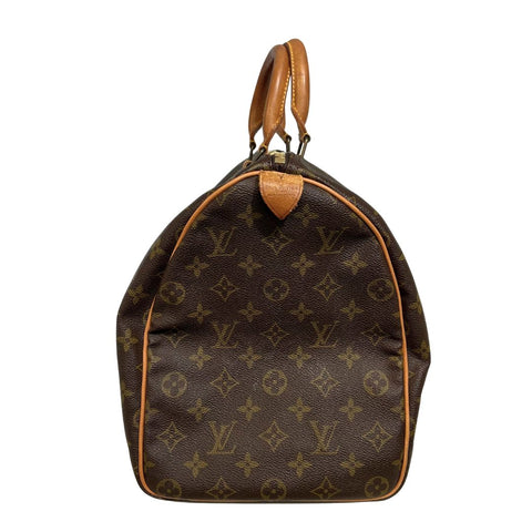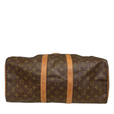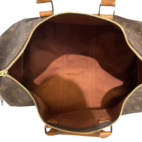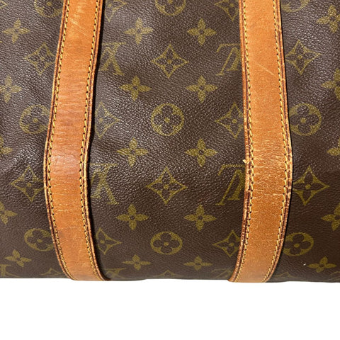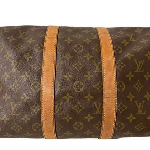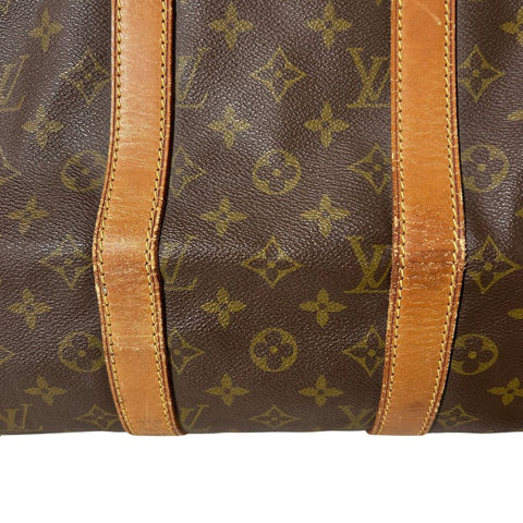 This stylish duffel is crafted of monogram coated canvas. It features vachetta leather top handles and gold tone hardware. The top zippers open to ...