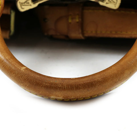 This shoulder bag features Vachetta cowhide leather trim including rolled top handles, a detachable shoulder strap and straps around the midline an...