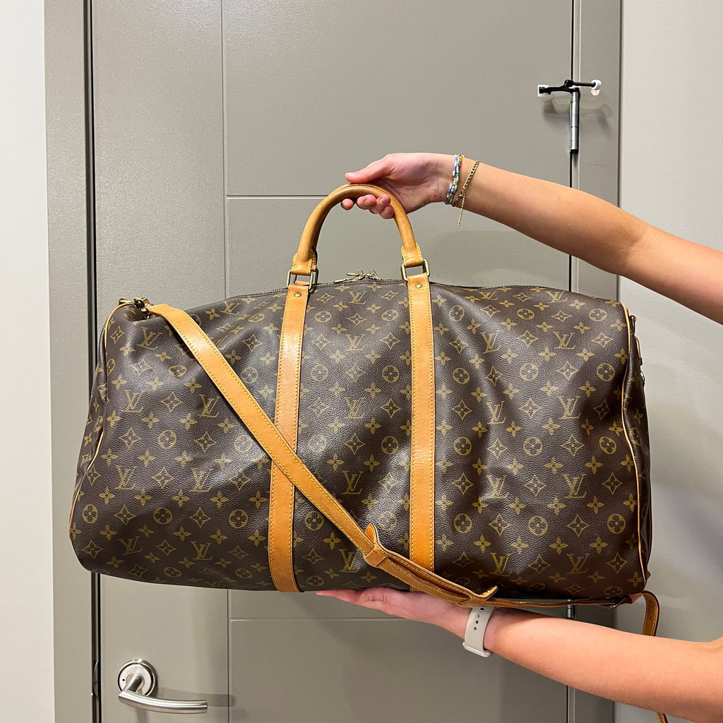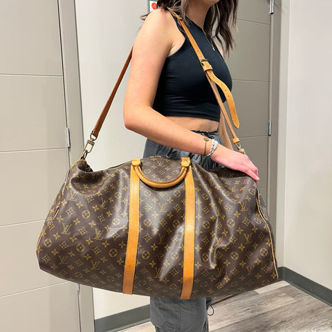 This stylish duffel is crafted of monogram coated canvas. It features vachetta leather top handles and brass hardware. The top zippers open to a c...
