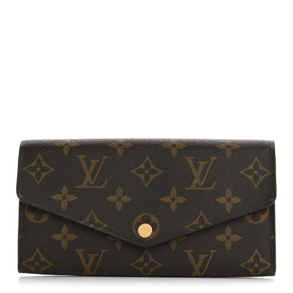 This wallet is crafted of traditional Louis Vuitton monogram toile canvas. The envelope-style crossover flap opens with a polished gold tone snap t...