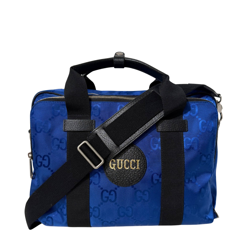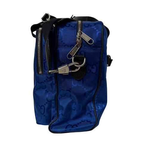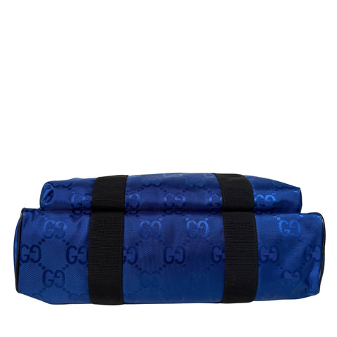 This stylish belt bag is crafted of Gucci blue GG nylon with smooth leather trim embellishment. It features silver-tone hardware, an detachable str...