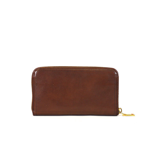 Suitable for all genders, this wallet is crafted of soft calf leather in brown. The wallet features a polished gold Prada logo and a 3/4 wrap-arou...