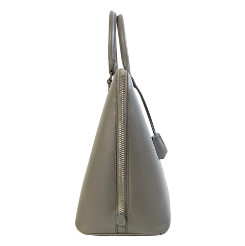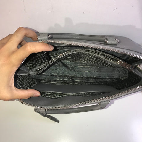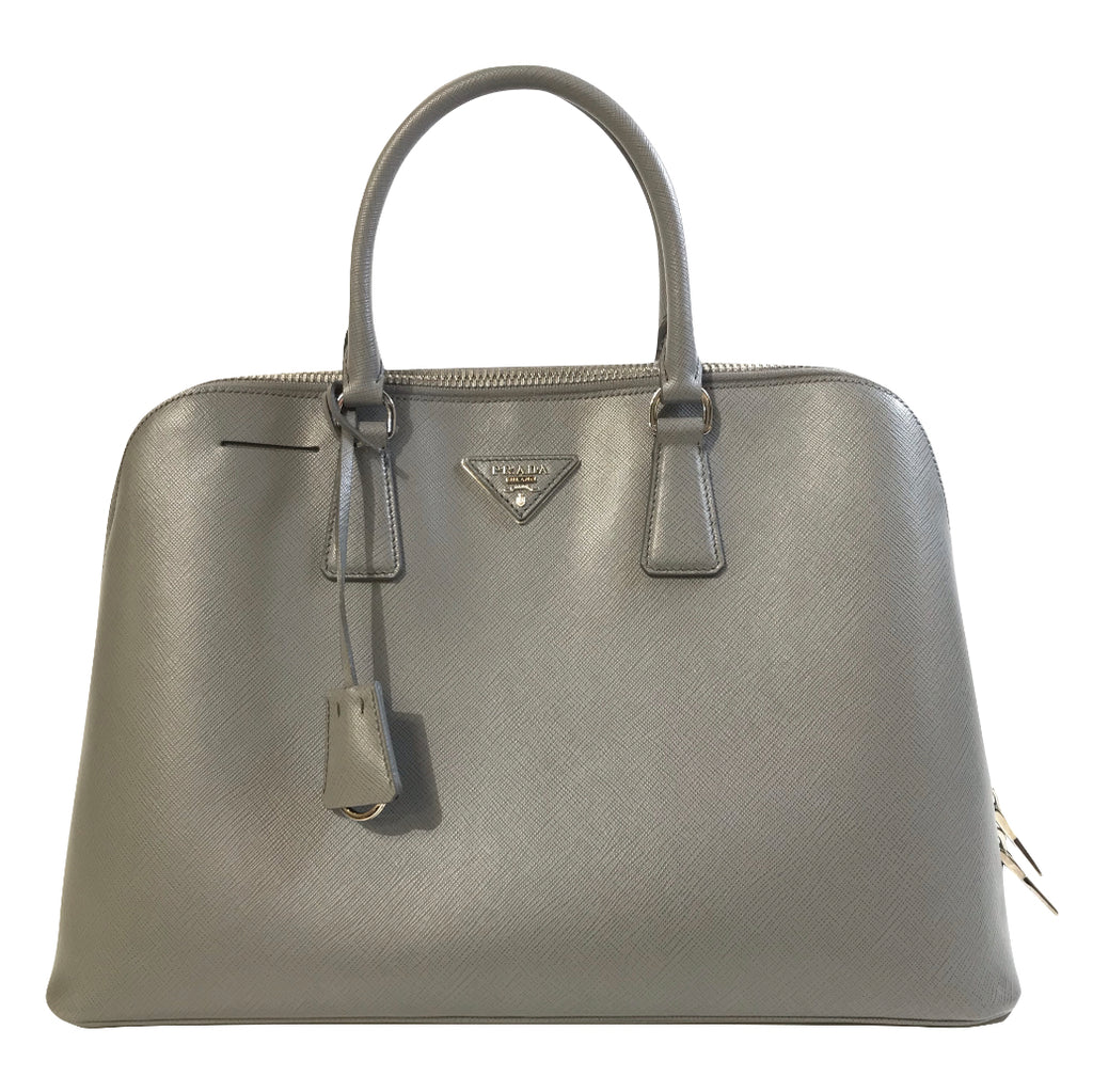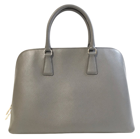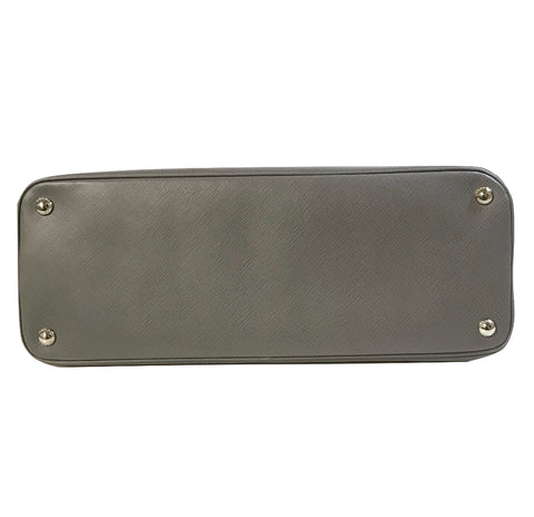 This stylish tote is crafted of Prada signature saffiano cross grained leather in grey. The bag features rolled leather top handles with polished ...