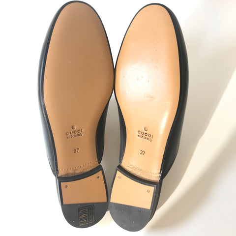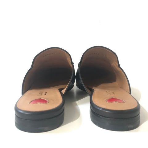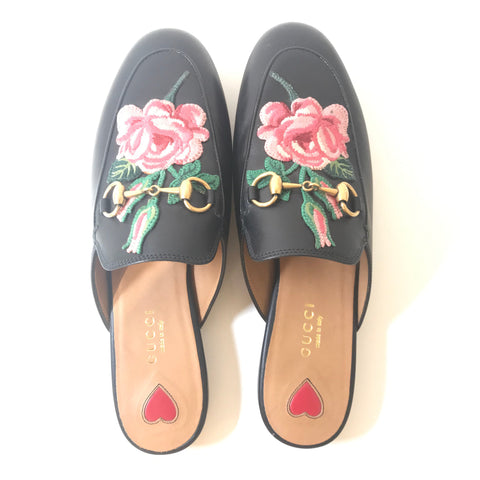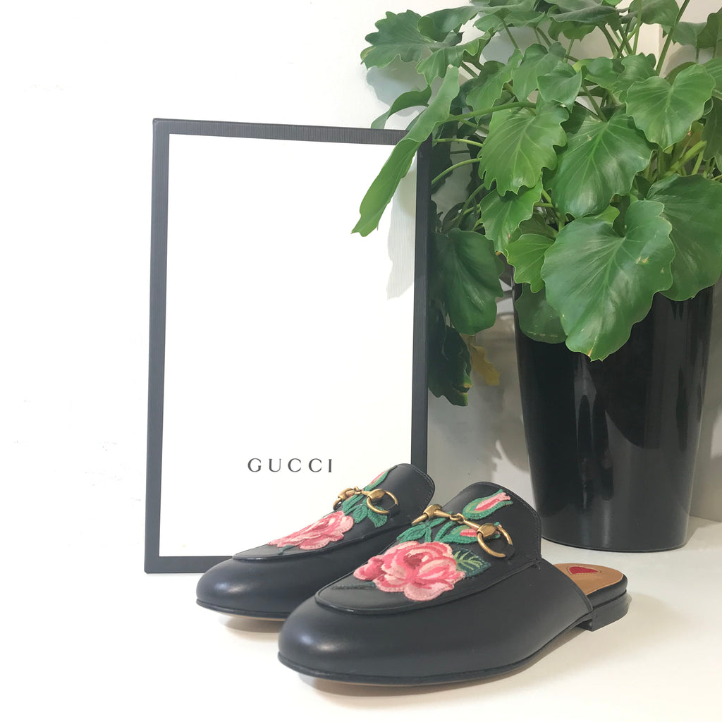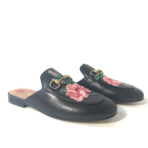 These chic mule design are crafted of smooth calfskin leather in black. Embroiled with rose motif. They feature an aged gold horsebit embellishment...