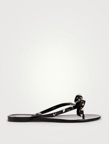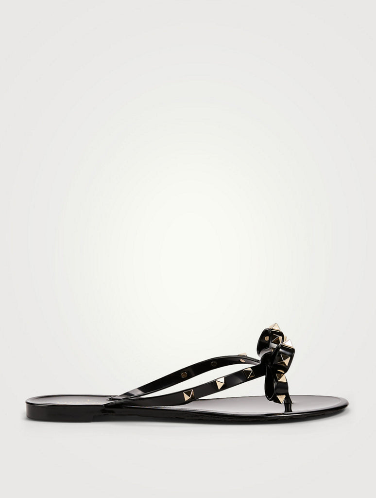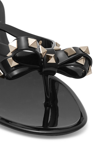 These trendy thong sandals are crafted of black jelly rubber with light gold pyramid studs lining the strap. Size: 39 Condition: Near Pristine Est...