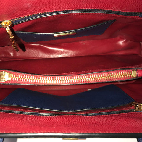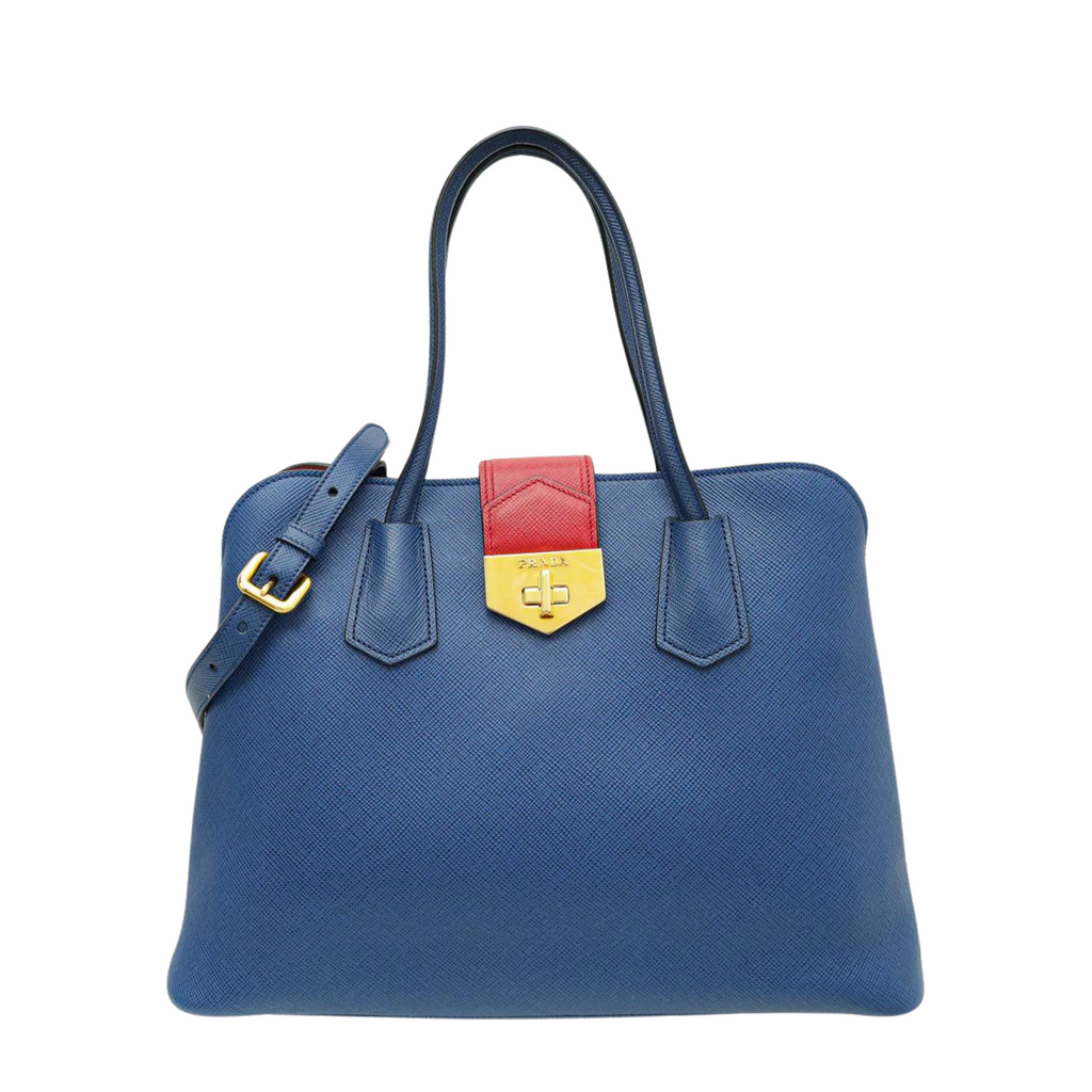 This elegant tote is crafted of beautifully textured cross-grain Saffiano leather in navy blue. It features leather top handles with a strap keeper...