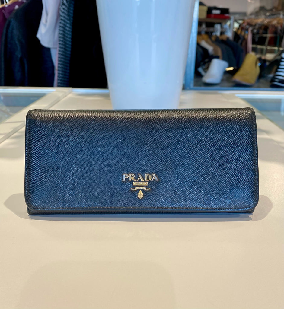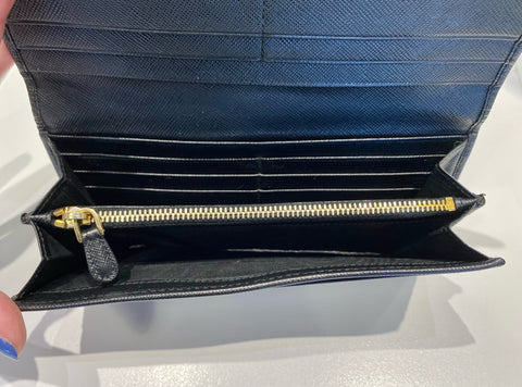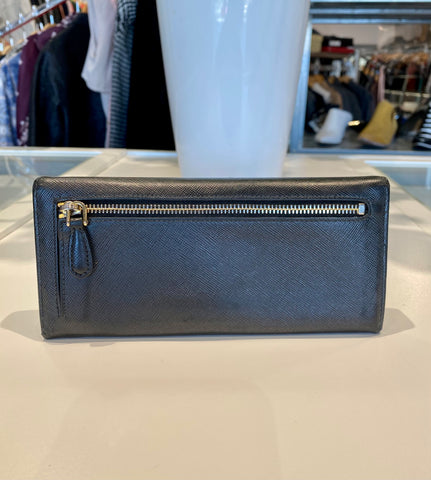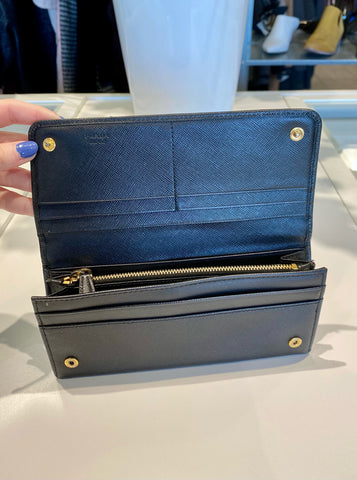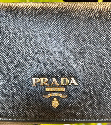 This wallet is finely crafted of saffiano leather in black and has polished gold hardware. The front facing flap opens to a partitioned black leath...
