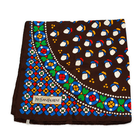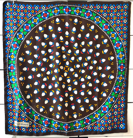 Made in France. 100% Silk. Approximate Dimensions: 34" X 32" Condition: Excellent - the scarf has been dry cleaned but a few stain spots on "Yves ...