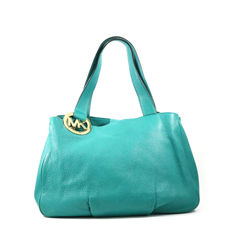 Soft blue genuine leather with leather straps, gold tone MK signature Ring, top snap closure, middle zipper compartment, interior features zip pock...