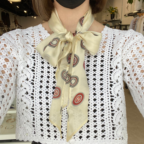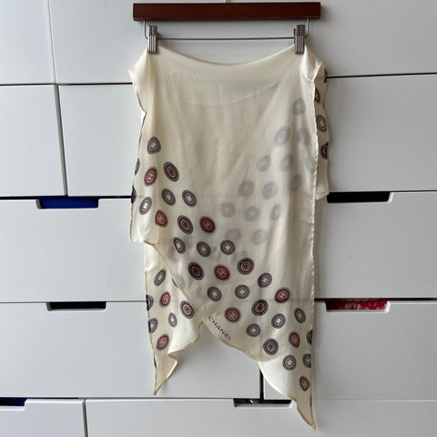 This stunning and hard-to-find silk scarf features the Chanel logos on white background, in a triangular shape. This is a beautiful scarf to be wo...